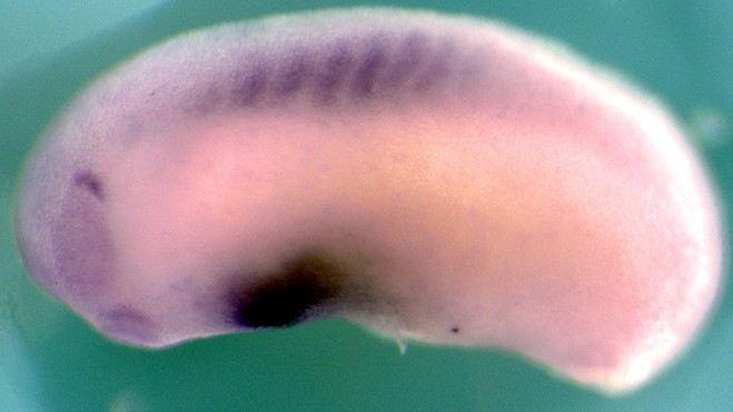 Larger Image ppp1r1a (protein phosphatase 1, regulatory (inhibitor) subunit 1A) gene expression in Xenopus laevis embryo, assayed via in situ hybridization, NF stage 28, lateral view, anterior left, dorsal up.