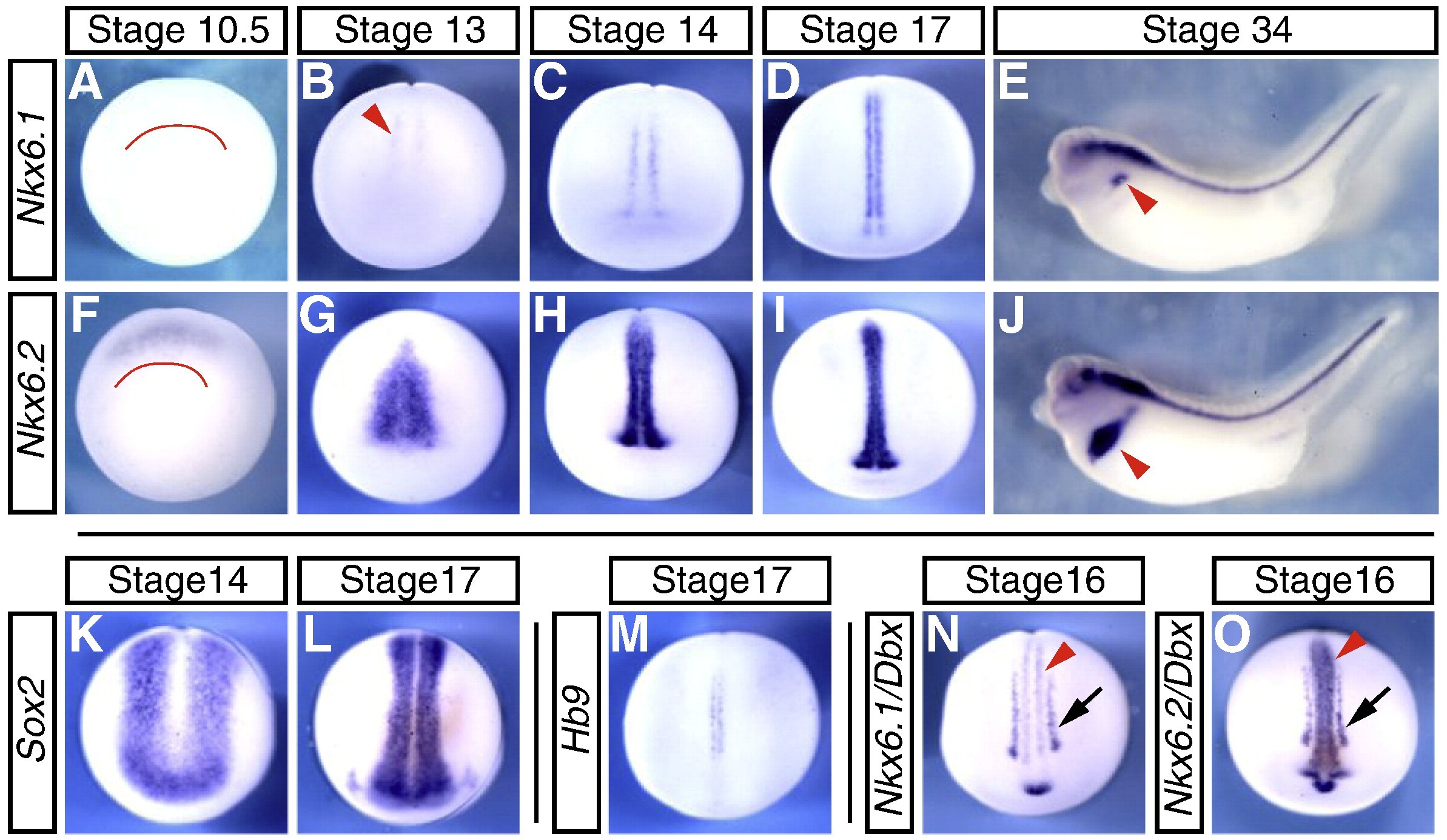 Larger Image Fig. 1. Expression of Nkx6 genes in X. laevis. (AâE) Whole mount in situ hybridization showing Nkx6.1 expression. (A) Nkx6.1 is not expressed during gastrulation. (B) Expression begins at stage 13 in two lateral stripes (red arrowhead) and intensifies at stage 14 (C). At stage 17 (D) Nkx6.1 expression marks where Hb9-positive MNs will form (compare to (M). (E) At stage 34, Nkx6.1 is expressed in the ventral spinal cord and hindbrain as well as the foregut (red arrowhead). (FâJ) Whole mount in situ hybridization showing Nkx6.2 expression. (F) Nkx6.2 is expressed during gastrulation in the dorsal ectoderm. Red line indicates the dorsal blastopore lip. (G) At stage 13, Nkx6.2 expression is detected in a broad part of the medial neural plate. At stage 14 (H) and stage 17 (I) Nkx6.2 expression extends through the medial developing hindbrain and spinal neural plate. (J) At stage 34, Nkx6.2 expression is detected in the ventral spinal cord and hindbrain as well as the foregut (red arrowhead). Nkx6.1 and Nkx6.2 expression is confined to the medial part of the neural plate when compared to the pan-neural marker Sox2 expression (compare (C, H) to (K); and (D, I) to, (L)). (N,O) Neither Nkx6.1 (N; red arrowhead) nor Nkx6.2 (O; red arrowhead) expression overlaps with Dbx1 expression (N,O; black arrows) at stage 16. Image published in: Dichmann DS and Harland RM (2011) Copyright © 2011. Image reproduced with permission of the Publisher, Elsevier B. V.