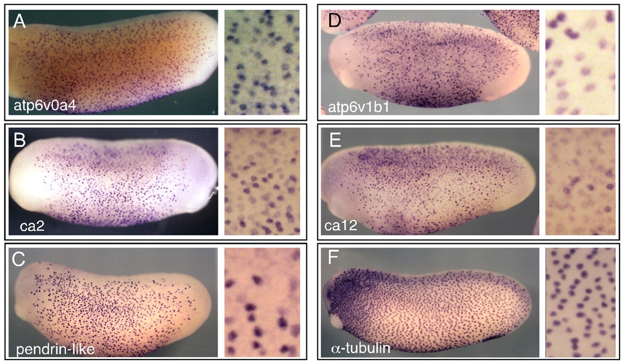 Larger Image Fig. 1. Expression of ion transport genes in the X. laevis larval skin. Whole-mount in situ hybridization on stage 26 tadpoles was used to localize transcripts encoding proteins involved in ion transport, including (A,D) two subunits of the H+v-ATPase, (B,E) two isoforms of carbonic anhydrase and (C) a pendrin-like anion exchanger. Note that these genes are expressed in scattered cells that are absent from the posterior and anterior areas of skin, in contrast to the pattern of ciliated cells marked by α-tubulin expression (F). A magnified view is shown in the neighboring panels. Image published in: Quigley IK et al. (2011) Copyright © 2011. Image reproduced with permission of the Publisher and the copyright holder. This is an Open Access article distributed under the terms of the Creative Commons Attribution License.
