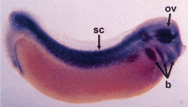 Larger Image cebpb (CCAAT/enhancer binding protein beta) gene expression in Xenopus laevis embryo, assayed via in situ hybridization, NF stage 29 & 30, lateral view, anterior right, dorsal up. This image is extracted from figure published in: Kousteni S et al. (1998), Image published in: Kousteni S et al. (1998) Copyright © 1998. Image reproduced with permission of the Publisher, Elsevier B. V.