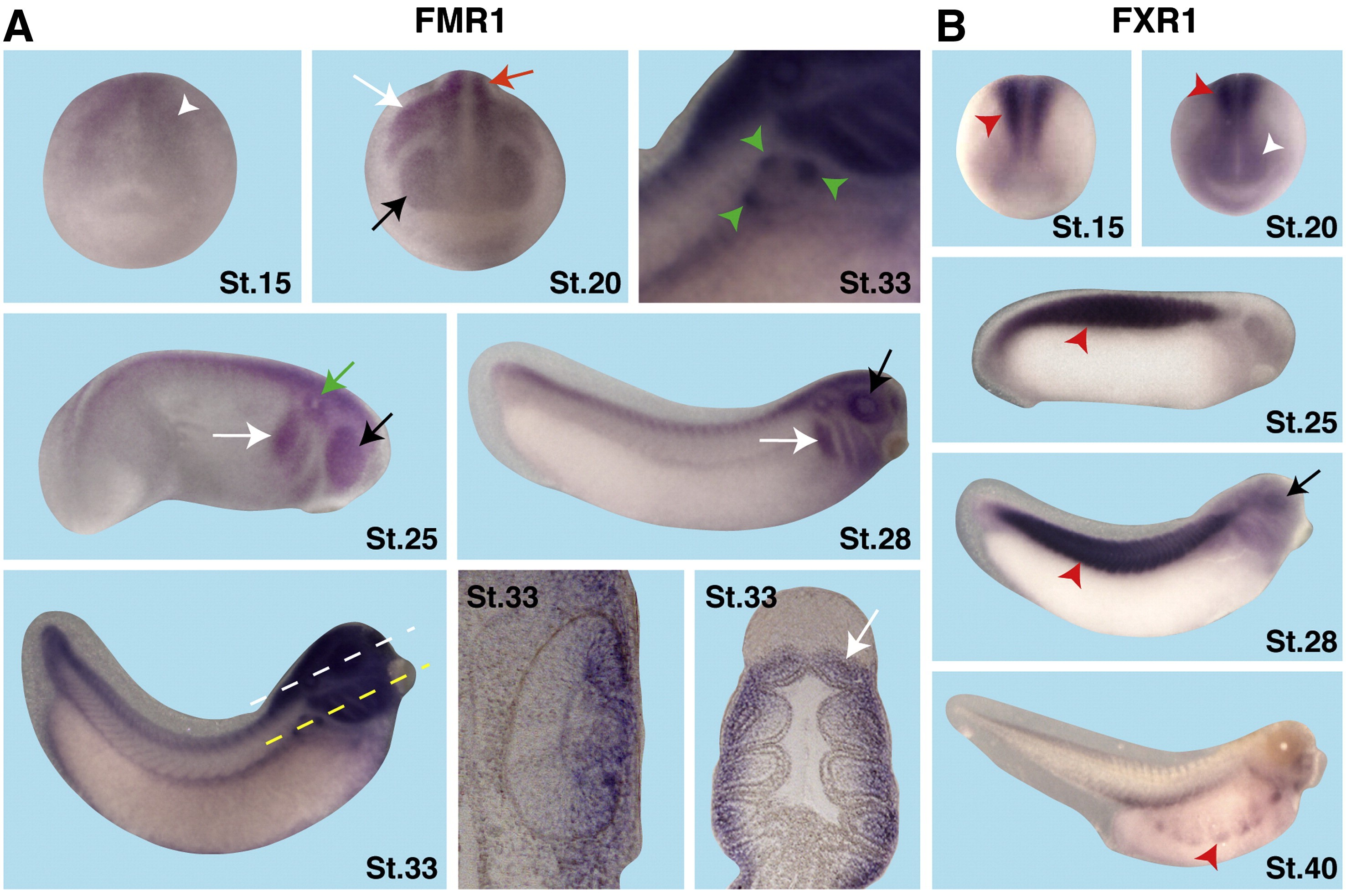 Suppl. Fig. 1. Spatial expression pattern of FMR1 and FXR1. A. WMISH detecting FMR1. At stage 15 a weak FMR1 expression can be detected in anterior neural tissue (white arrowhead). At stage 20, FMR1 transcripts can be visualized in the neural tube (red arrow), the migrating cranial NC cells (white arrow) and the eye anlage (black arrow). Expression in the eye and the NC is maintained at later stages 25, 28, and 33. FMR1 is also expressed in the otic vesicle (stage 25, green arrow) and the pronephric nephrostomes (stage 33, green arrowheads). At stage 33 FMR1 is expressed in the lens and the ciliary marginal zone of the eyes (left vibratome section on the level of the white dotted line) and parts of the pharyngeal arches (right vibratome section on the level of the yellow dotted line, white arrow). B. Spatial expression pattern of FXR1. In all examined stages, FXR1 transcripts can be detected in the somites (e.g. stage 28 red arrowhead) and at stage 40 in the migrating hypaxial muscle cells (red arrowhead). At stage 20, FXR1 is additionally expressed in the anterior neural tissue (white arrowhead).