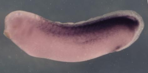 Larger Image postn (periostin, osteoblast specific factor) gene expression in Xenopus laevis embryo via in situ hybridization, NF stage 27, lateral view, anterior left, dorsal up. Image copyrighted by:Kuehl lab. For further details see Tao et al., 2011, Dev. Genes Evo., 221, 247-54 Image created by: Michael Kühl