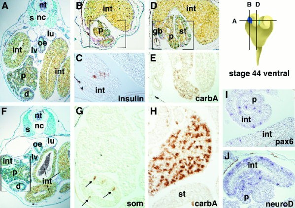 Larger Image Fig. 6. Histological analysis of molecular markers in stage 446 Xenopus tadpoles. A) Stained transverse section of a stage 44 tadpole. B) Stained sagittal section of a stage 44 tadpole. C) Sagittal section of a stage 44 tadpole, similar to the bracketed area in E, stained with an anti-insulin antibody. D) Stained sagittal section of a stage 44 tadpole, more medial than the section in B. E) Sagittal section of a stage 44 tadpole, similar to the bracketed area in D, stained with an anti-carboxypeptidase A (carbA) antibody. F) Stained transverse section of a stage 46 tadpole. G) Transverse section of a stage 46 tadpole, similar to the bracketed area in F, stained with an anti-somatostatin (som) antibody. Arrows point to positively stained cells in the duodenum. H) Transverse section of a stage 46 tadpole that is slightly more posterior to the section in F, allowing one to see the distal end of the stomach joining with the duodenum. The section is stained with an anti-carboxypeptidase A antibody. I) Pax6 RNA expression in a sagittal section of a stage 45 tadpole. J) NeuroD RNA expression in a sagittal section of a stage 45 tadpole. Approximate planes of section are shown in the schematic diagram. Abbreviations: d, duodenum; gb, gall bladder; int, intestine; lv, liver; lu, lung; nc, notochord; nt, neural tube; oe, oesophagus; p, pancreas (blue); pn, pronephros; s, somite; st, stomach. Image published in: Kelly OG and Melton DA (2000) Copyright © 2000. Image reproduced with permission of the Publisher, John Wiley & Sons.