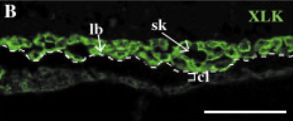 Larger Image krt5.5 (keratin 5, gene 5 ) gene expression in Xenopus laevis embryos, NF stage 54, as assayed by immunohistochemistry. Coronal section of skin, superficial up. This image is extracted from figure published in: Utoh R et al. (2003), Image published in: Utoh R et al. (2003) Copyright © 2003. Image reproduced with permission of the Publisher, John Wiley & Sons.