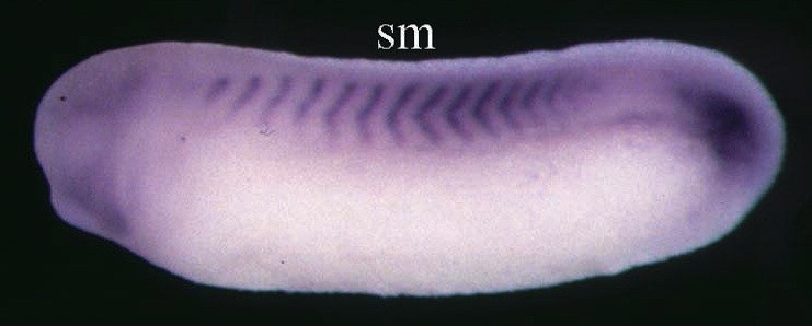 Larger Image tgfb1 (transforming growth factor, beta 1) gene expression in Xenopus laevis embryo, assayed via in situ hybridization, NF stage 27, lateral view, anterior left, dorsal up. This image is extracted from figure published in: Kondaiah P et al. (2000), Image published in: Kondaiah P et al. (2000) Copyright © 2000. Image reproduced with permission of the Publisher, Elsevier B. V.