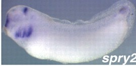 Larger Image spry2 (sprouty homolog 2) gene expression in Xenopus laevis embryo, assayed via in situ hybridization, NF stage 32, lateral view, anterior left, dorsal up. Image published in: Panagiotaki N et al. (2010) Copyright © 2010. Image reproduced with permission of the Publisher and the copyright holder. This is an Open Access article distributed under the terms of the Creative Commons Attribution License.