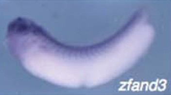 Larger Image zfand3 (zinc finger, AN1-type domain 3) gene expression in Xenopus laevis embryo, assayed via in situ hybridization,NF stage 30, lateral view, dorsal up, anterior left. This image is extracted from figure published in: Cuykendall TN and Houston DW (2010), Image published in: Cuykendall TN and Houston DW (2010) Copyright © 2010. Image reproduced with permission of the Publisher, John Wiley & Sons.