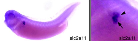Larger Image hypothetical LOC495492 (slc2a11) gene expression in Xenopus laevis embryo, assayed via in situ hybridization, NF stage 35 & 36, lateral view, anterior left, dorsal up. This image is extracted from figure published in: Raciti D et al. (2008), Image published in: Raciti D et al. (2008) Copyright © 2008 Raciti et al. Creative Commons Attribution license