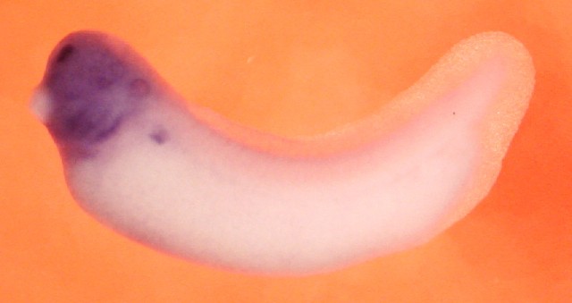 Larger Image abcg2 (ATP-binding cassette, sub-family G (WHITE), member 2) gene expression in Xenopus laevis embryo, assayed via in situ hybridization, NF stage 33 & 34, lateral view, anterior left, dorsal up. Copyright © Patient Lab, Aldo Ciau-Uitz