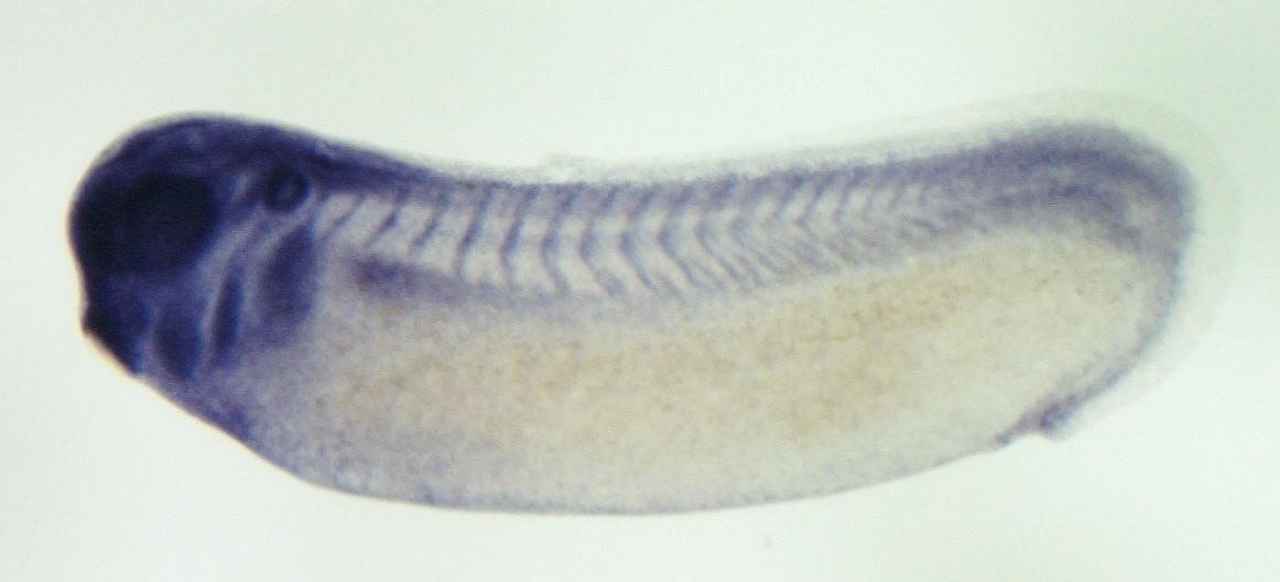 Larger Image arnt (aryl hydrocarbon receptor nuclear translocator) gene expression in Xenopus laevis embryo, assayed via in situ hybridization, NF stage 26, lateral view, anterior left, dorsal up. Copyright © Patient Lab