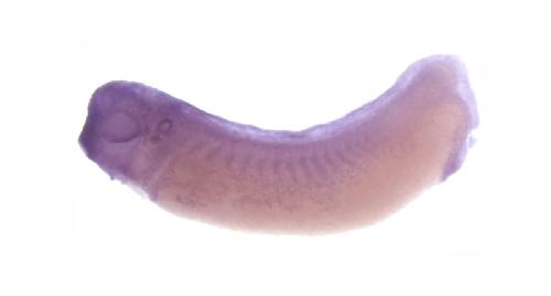Larger Image slc9a1 (solute carrier family 9, subfamily A (NHE1, cation proton antiporter 1), member 1) gene expression in Xenopus laevis embryo, assayed via in situ hybridization, NF stage 29 & 30, lateral view, anterior left, dorsal up. Image created by: Brändli Lab