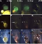 A-E: The onset of cardiac fluorescence in a MLC2::GFP embryo can be detected faintly at stage 31 and is then more easily observed during heart looping stages. A: Ventral view of the heart-forming region at stage 31, anterior is to the top. B: Stage 33. C: Stage 36. D: Stage 41. E: Stage 46. F-I: Left lateral views showing the early detection of GFP in the heart. F, G: Bright field view and detail view of fluorescence at stage 31. H, I: Comparable images at stage 33. J-N: The GFP emission is restricted solely to the heart myocardium and is absent from all skeletal and smooth muscle. Images taken at stage 46. J, K: Bright field and fluorescence images of a left lateral view of the tadpole head and trunk. L: Left lateral detail of heart fluorescence. M, N: Bright field and fluorescence images of the ventral trunk. All images presented are of the same transgenic animal. H, heart; OT, outflow tract; A, atria; V, ventricle.