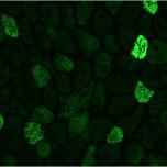 GFP expression in mitochondria membranes, with GFP is expressed strongly in gonads. Germ cells have GFP labeled mitochondria, which are retained mostly during one generation in females. |