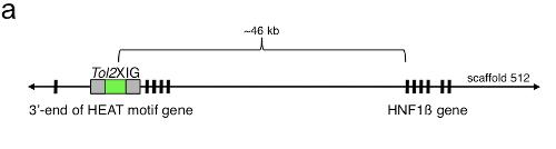 Schematic representation of the Tol2XIG integration event in joh (not to scale). The transposition reaction resulted in integration of the transposon in intron 9 of a novel HEAT motif-containing gene on scaffold 512:565147.