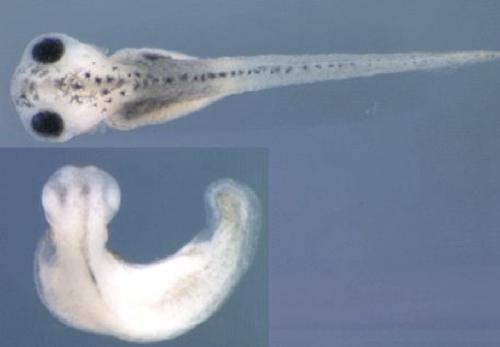 Pleiotropic effect on eye (retinal lamination defect, no lens), neural crest (poor/absent melanophore migration). Pericardial edema and bent body axis are also observed. Development arrests at ~ NF stage 28-32. |