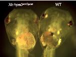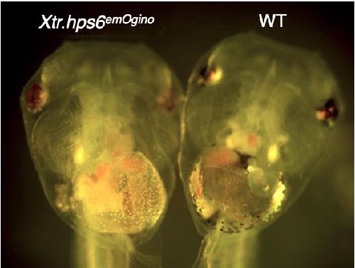 mutant CRISPR hps6 Xtropicalis tadpole on left [Xtr.hps6{emOgino}] v wild type Xtropicalis tadoles (on right)