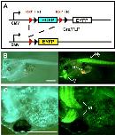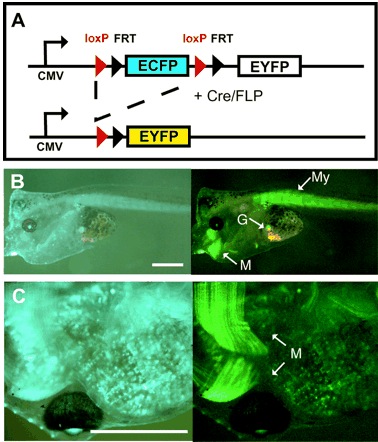 Larvae show blue fluorescence that turns into yellow fluorescence upon Cre recombinase action. |